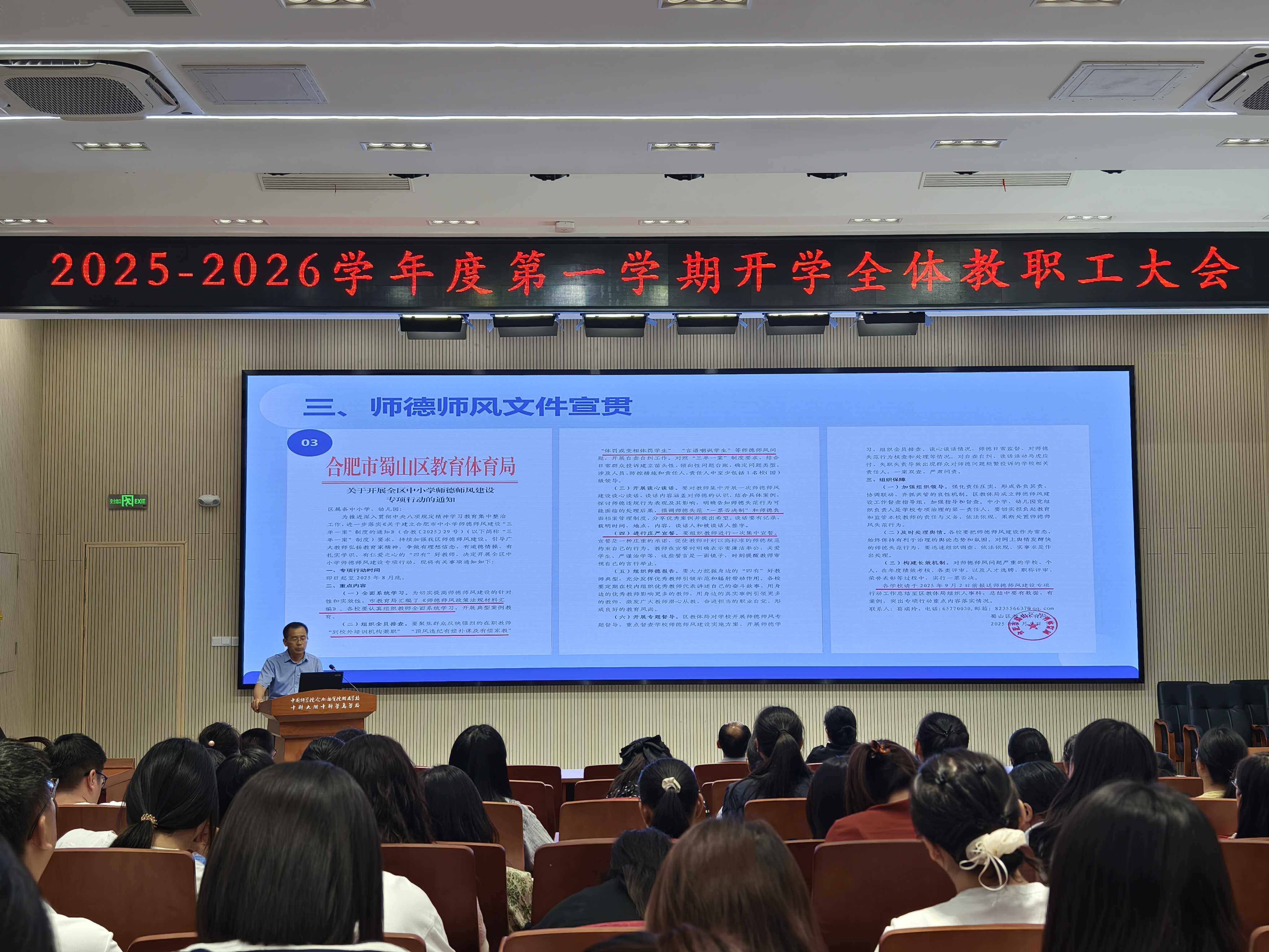 8月27日上午,常务副校长高龙锦以《以案示警 立德树人——中小学教师履职尽责中的人际关系处理》为主题,给全体教职工上师德教育第一课。他强调,教师要善于处理与学生之间的关系,坚持教师主导、学生主体,并通过教育惩戒案例进行警示;在家校沟通方面,应建立有效沟通机制与信任基础,妥善处理分歧,警惕“等距离交往”和“违法创收”等行为;在与同事相处中,倡导协作共赢、尊重专业自主,平衡个人风格与团队意识,远离“圈子文化”;此外,在与个体内在关系中不仅要实现自我的全面发展,突破舒适区,保持进取动力,还要关注自身的身心健康,实现工作与生活的和谐统一。