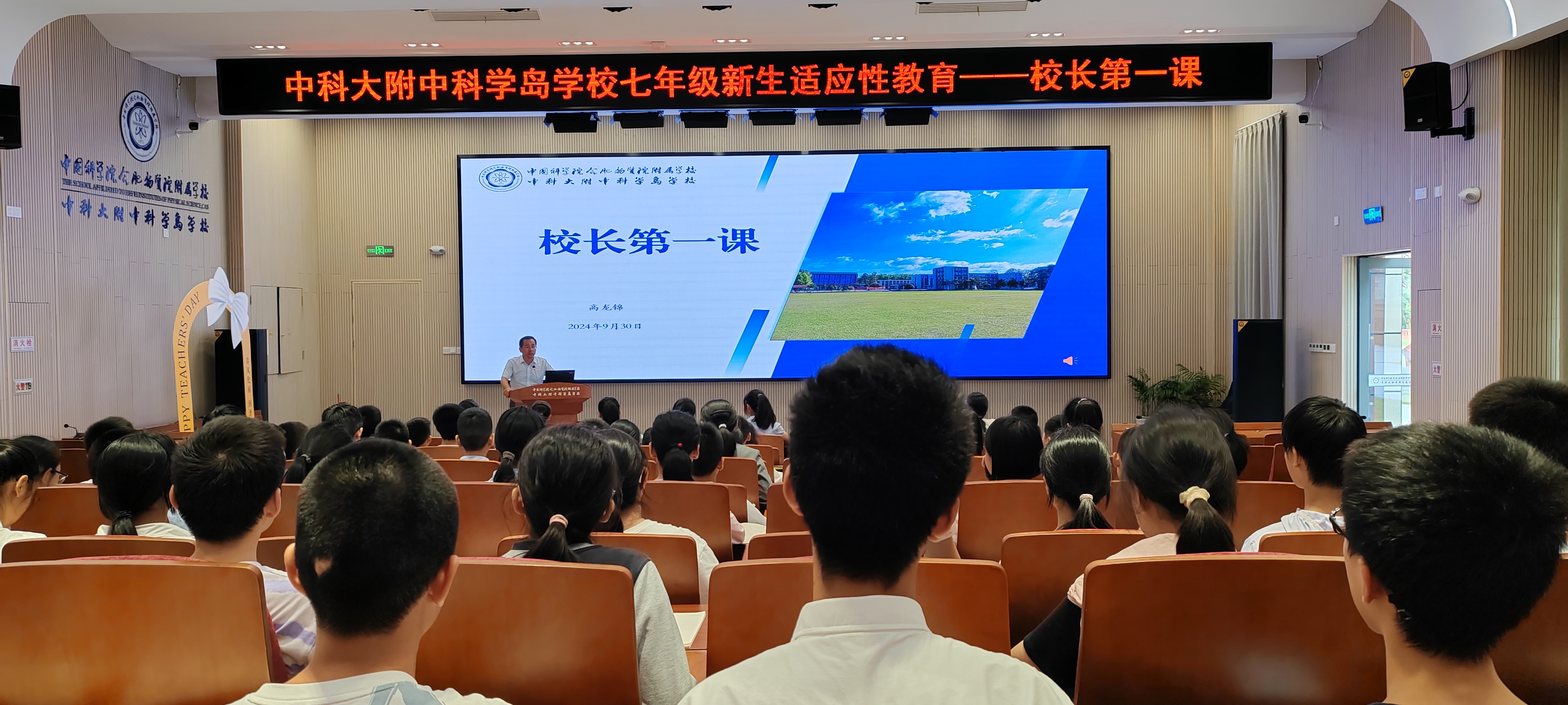 高龙锦首先对七年级的同学们表示欢迎,欢迎他们成为学校的一员。而后,从学校历史变迁、文化标识、科创特色、共同约定四个方面缓缓展开教育画卷。