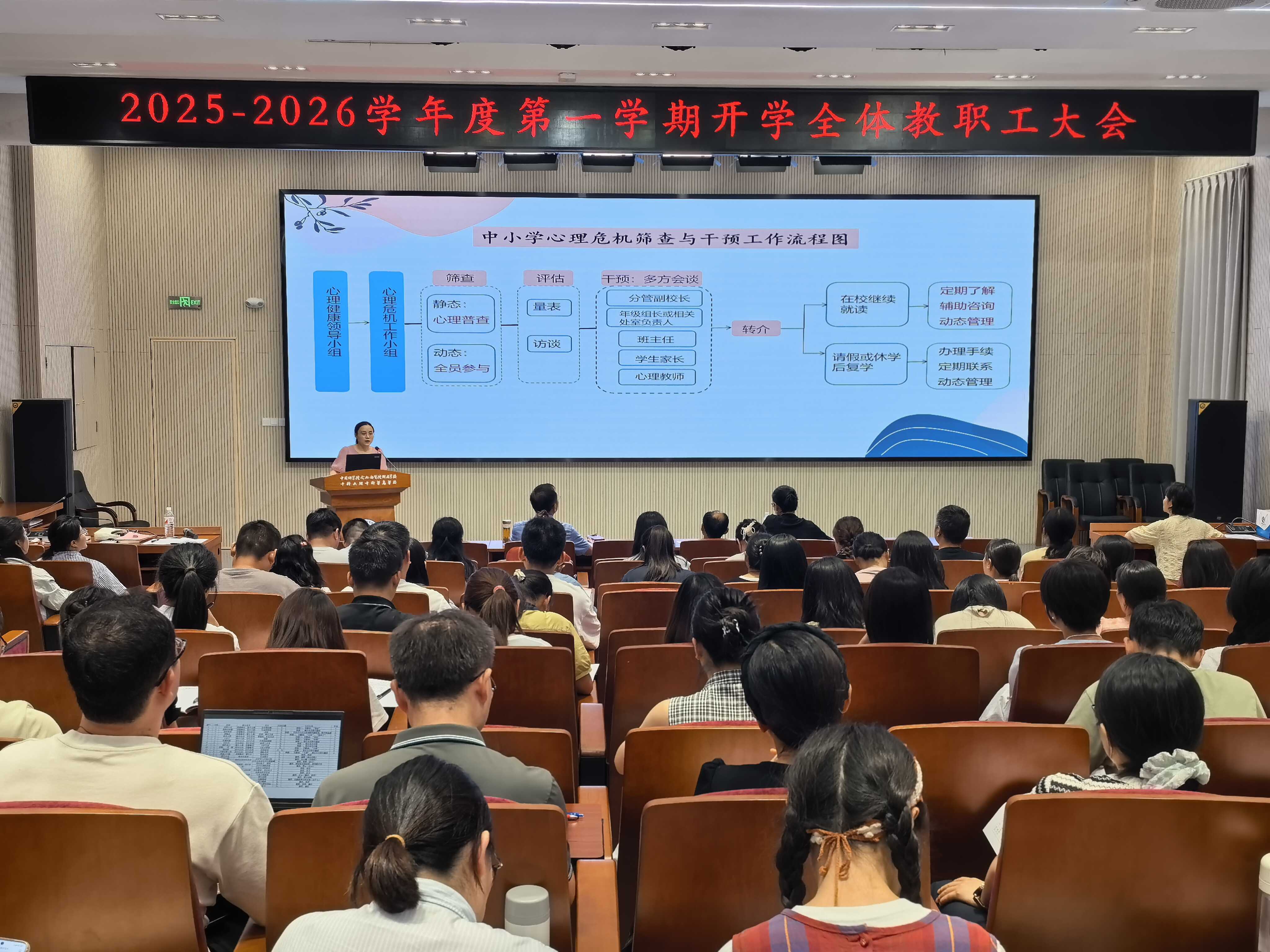 为切实提高教师心理健康教育工作的能力,构建积极向上的校园成长环境,守护孩子们的身心健康成长,8月27日下午,我校在报告厅开展了以心理健康素养提升为主题的校本培训,全体教职工参与学习,共同探讨提升心理健康教育工作能力的路径。