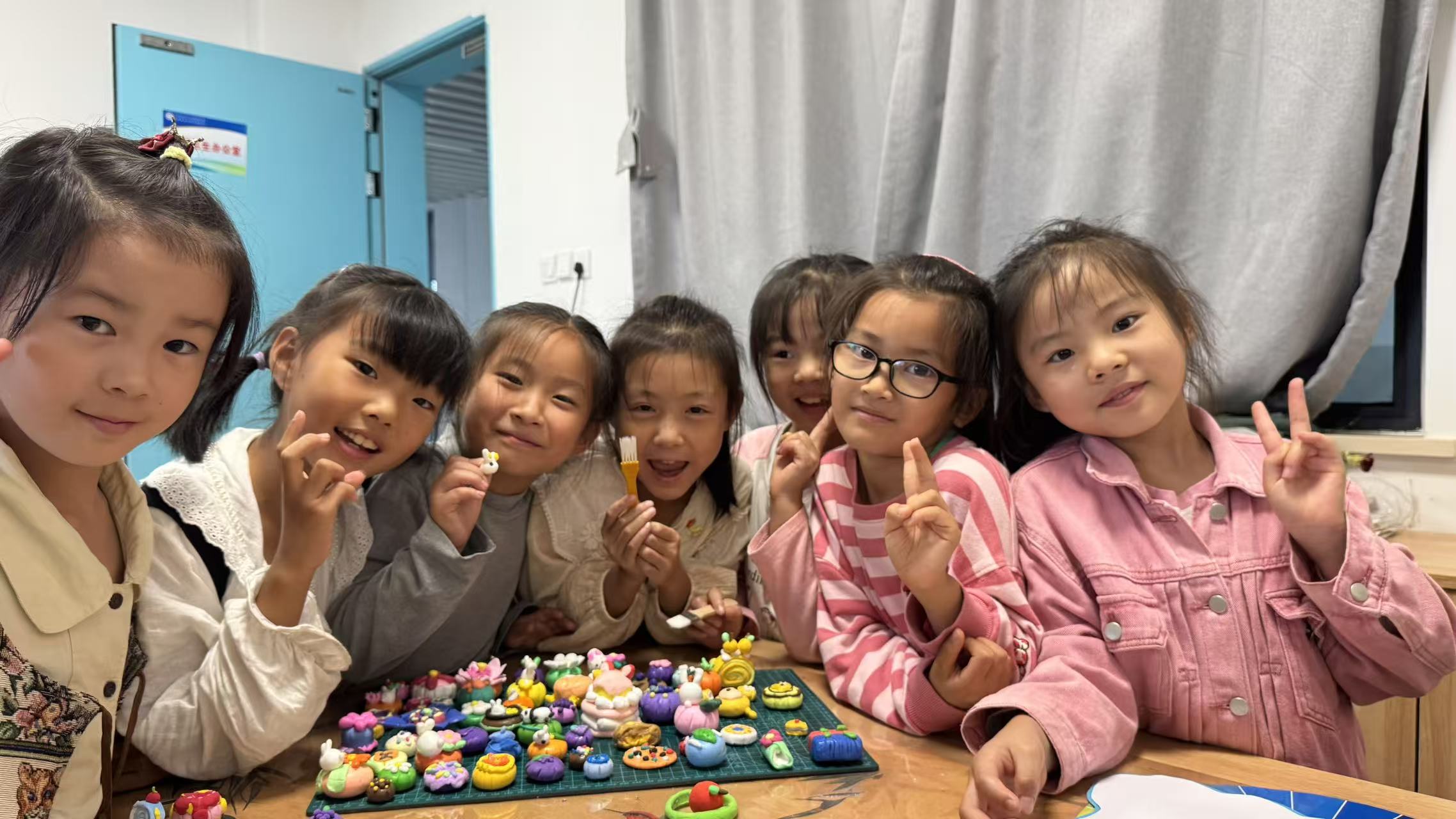 巧手塑团圆,童心绘山河。低年级学生化身“小小艺术家”,手绘国庆图画,天安门、国旗等元素跃然纸上,勾勒出孩子们心中的壮丽山河;他们还用黏土巧制月饼,揉捏塑形间,传统习俗悄然浸润心田,团圆之意在指尖流转。
