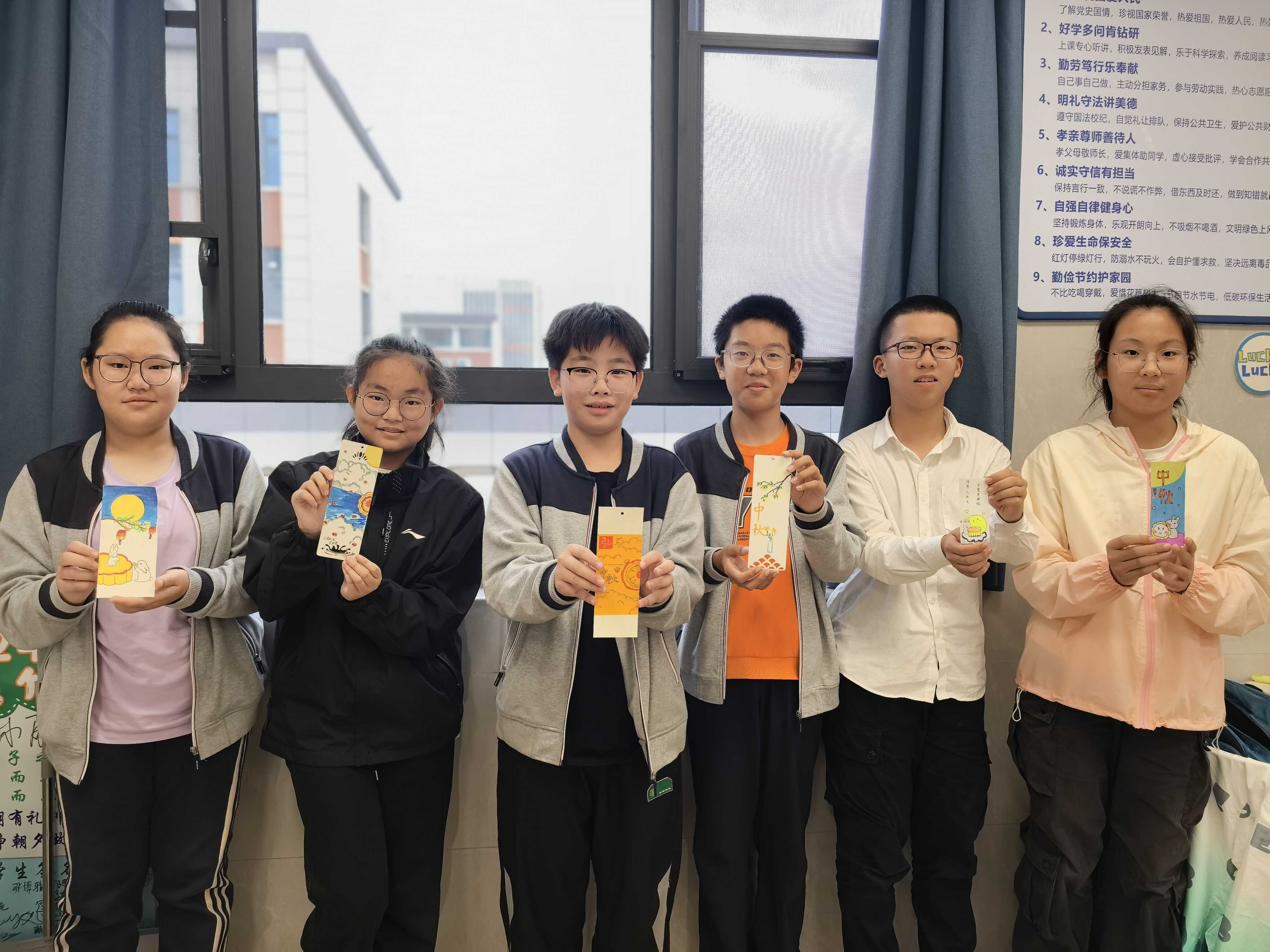 金石铸风骨,丹青见精神。初中部同学将艺术创作与家国情怀深度融合:七年级学子篆刻“团圆”“中秋”主题印章,于方寸之间展现金石风骨,此外还精心制作了以国旗红、五星黄为主色调的国庆爱心手环,以指尖巧思传递对祖国的赤诚祝福;八年级同学倾心绘制中秋主题书签,笔下明月皎洁如璧,祥云悠然若卷,每一笔细腻丹青都晕染着节日意蕴,更承载着千年文化精神的脉脉传承。