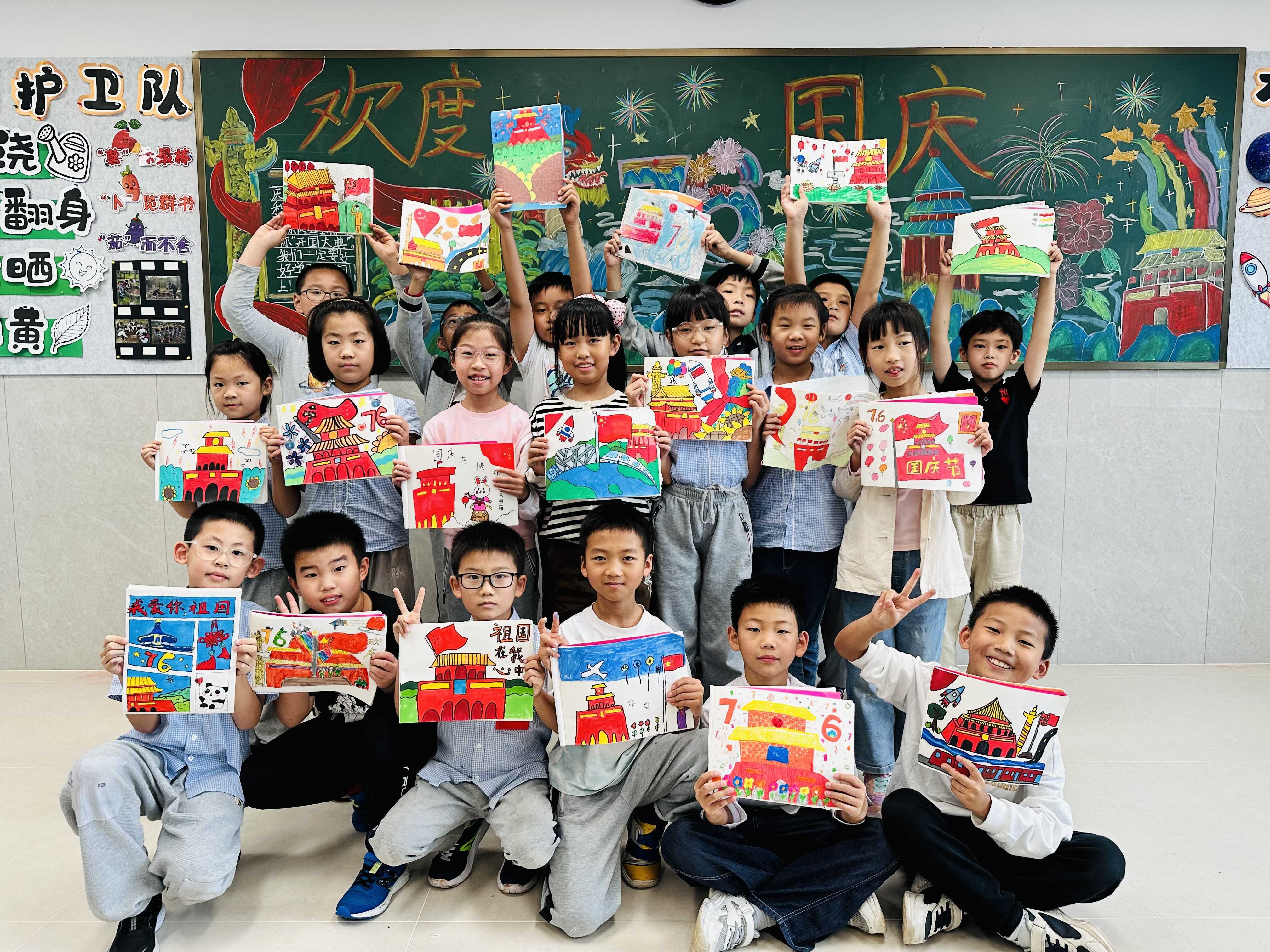 翰墨书宏愿,方寸载深情。高年级同学以笔墨书写家国情怀。一张张精心制作的贺卡满载对祖国的祝愿,一幅幅中秋画作将传统意象与校园生活巧妙融合。书法课上,同学们挥毫泼墨,在方寸宣纸间寄托对家国的深厚情感,展现新时代少年的文化自信与责任担当。