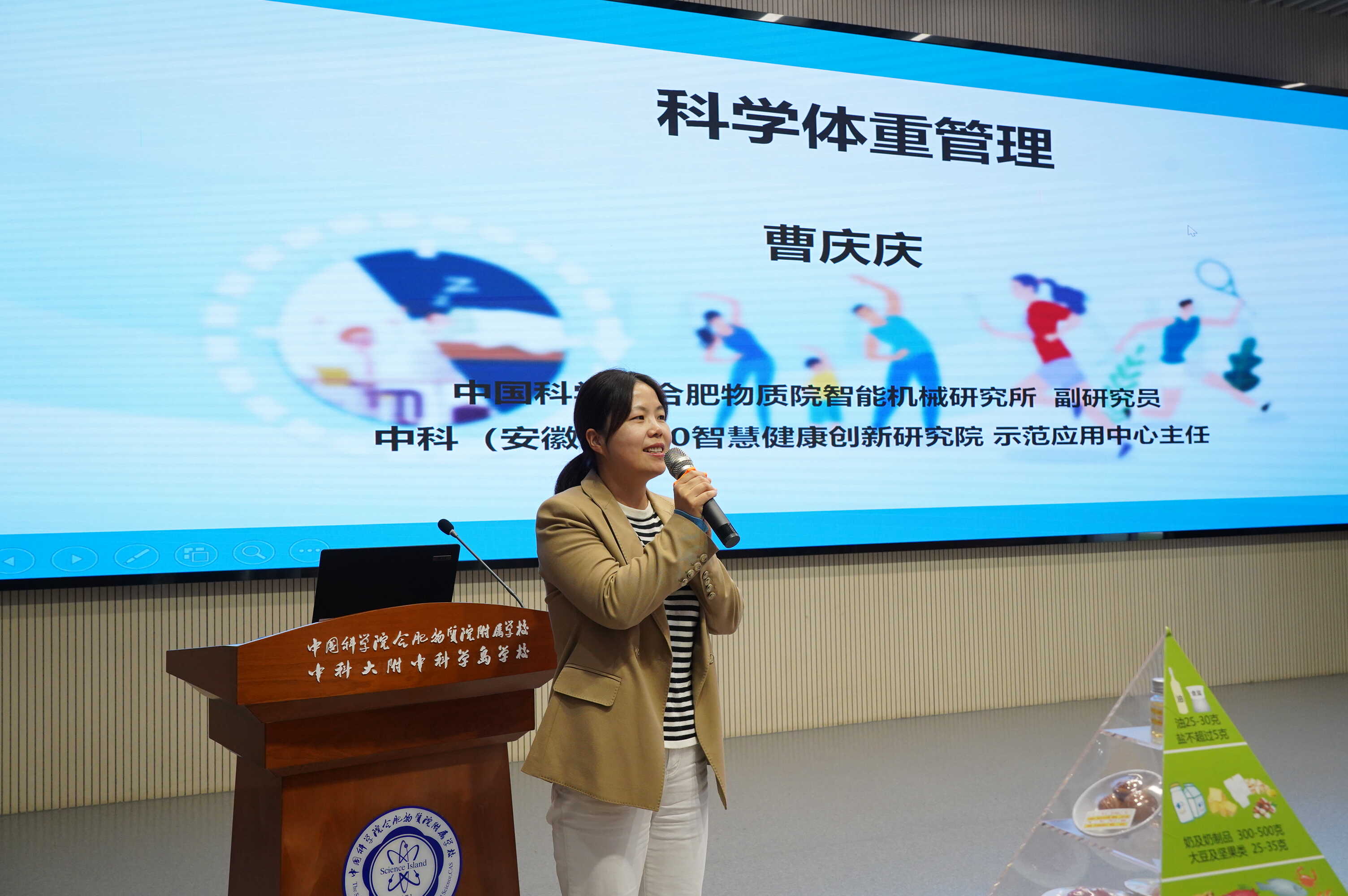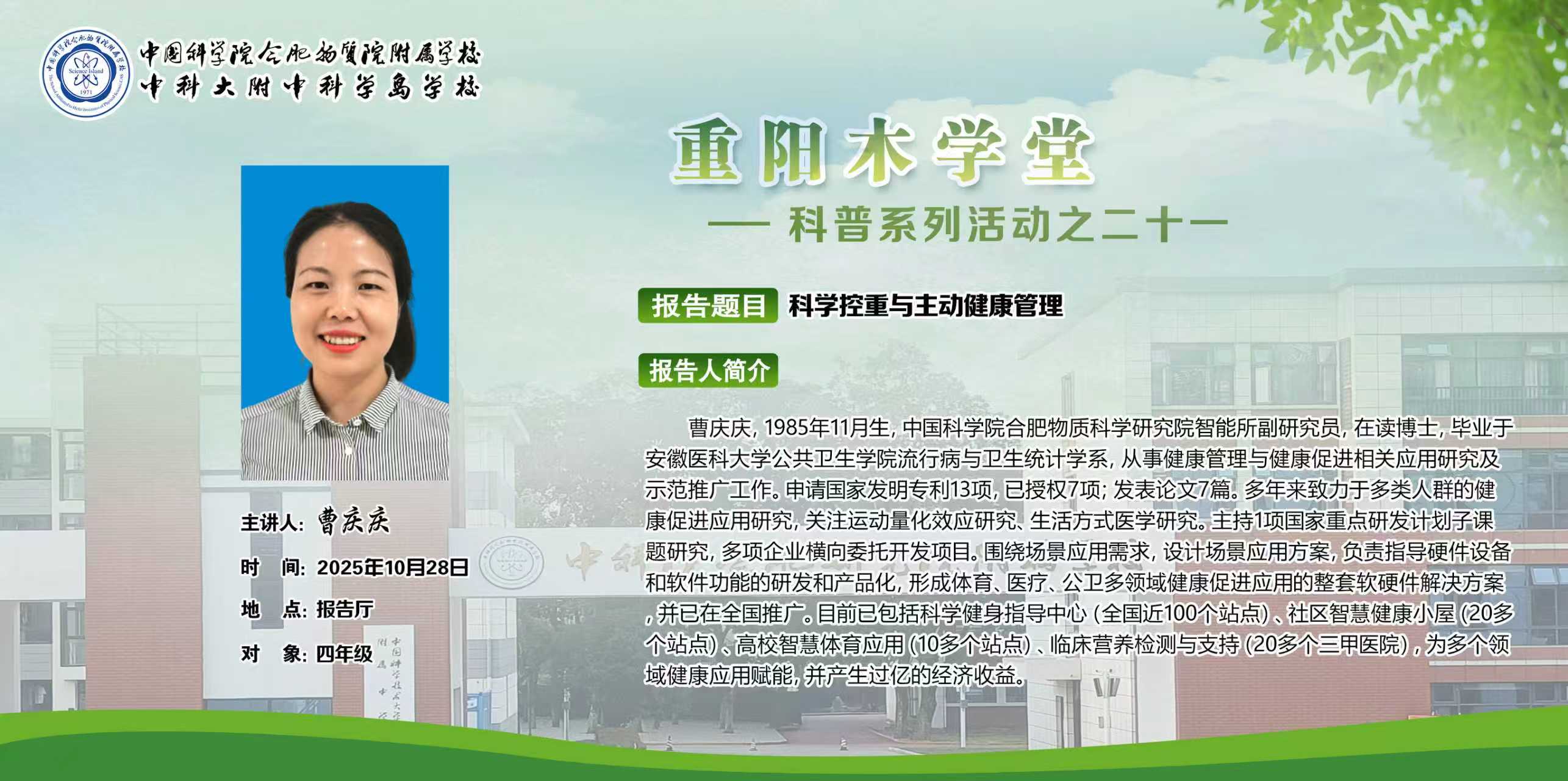 10月28日,重阳木学堂第二十一期在我校报告厅顺利举行。本期重阳木学堂邀请到中国科学院合肥物质院智能机械研究所副研究员、中科(安徽)G60 智慧健康创新研究院示范应用中心主任曹庆庆,为四年级同学们带来一堂既讲透科学原理、又充满互动乐趣的科学体重管理科普讲座。