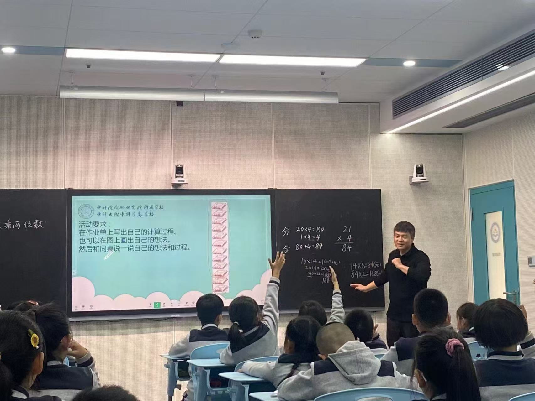 我校赵贺宇老师执教的“两位数乘两位数”巧妙的将新旧知识与方法之间建立链接,多层次、多维度帮助学生理解算理,理清算法。整节课基于学生起点,提供给学生直观图作为研究素材,最后把求积转化成小圆点的个数,通过圈一圈、画一画、写一写的方式,把“两位数乘两位数”的算法形象直观地展现出来,帮助学生深度理解。