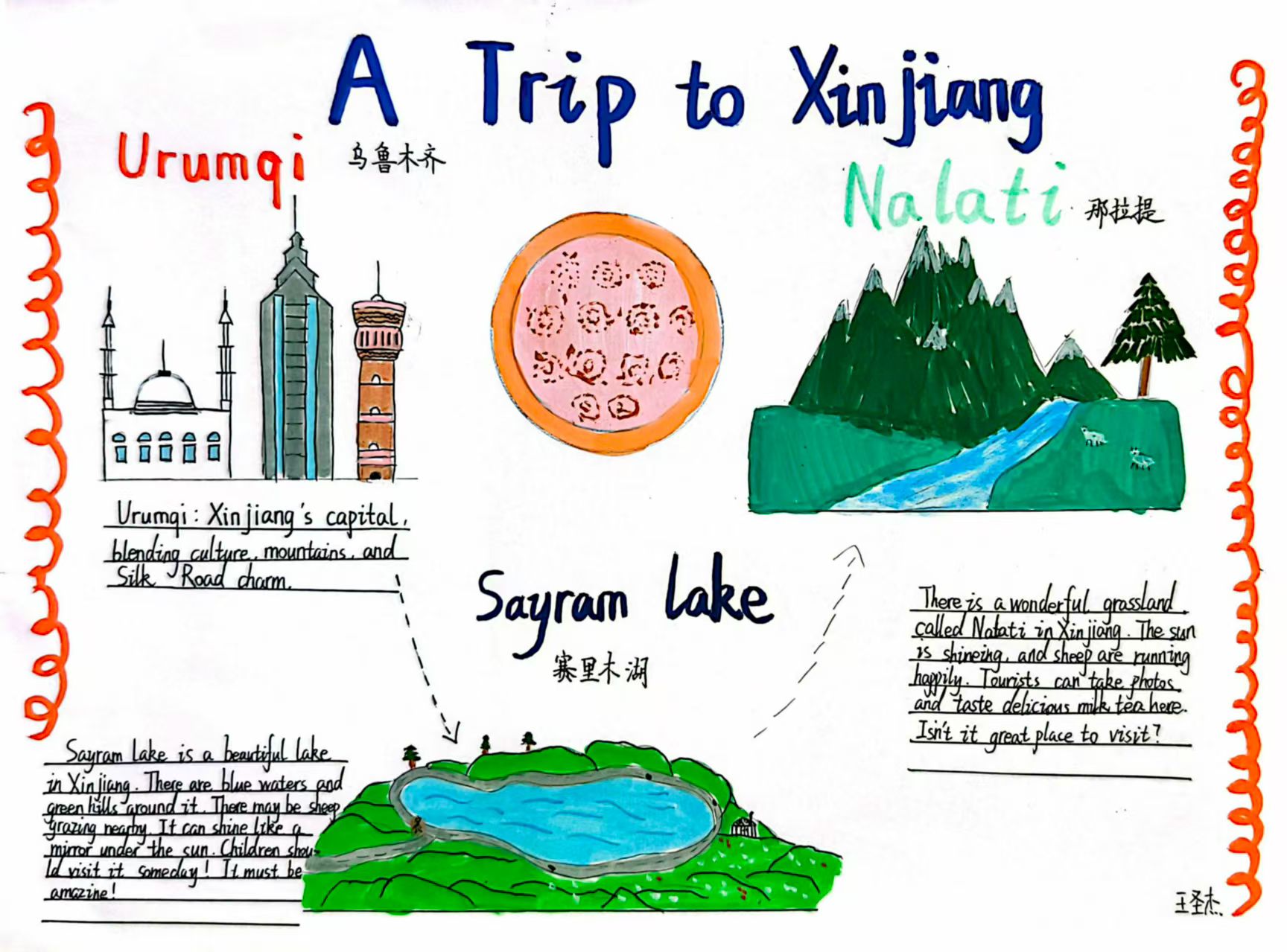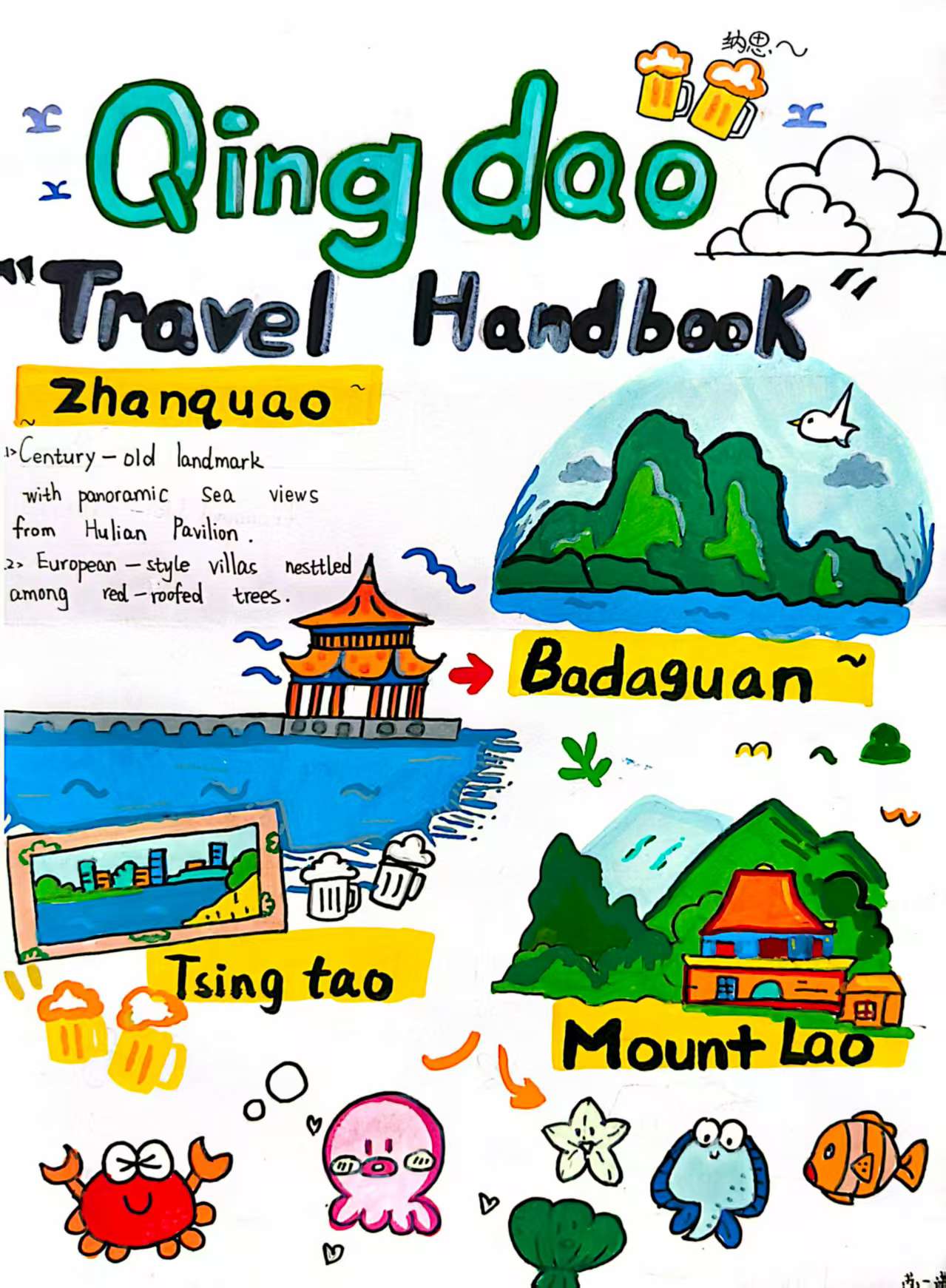 有的拍摄家庭真实餐盘照片,用英文单词或句子标注自己的餐盘作品。四年级学生都是“时尚设计师”,他们制作特色时尚服饰小报,设计绘画各国特色服饰,并用英语进行简单描述。五年级同学创作旅行日记,根据假期体验完成情境式日记特色小报,或拍摄旅行记录Vlog,让英语融合进日常生活。