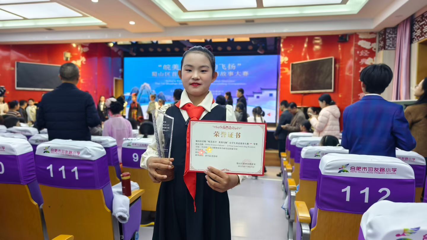 在11月25日落幕的蜀山区首届“皖美童声,英韵飞扬”小学生英语故事大赛决赛中,我校五(1)班李嘉轩同学凭借出色表现,荣获一等奖。
