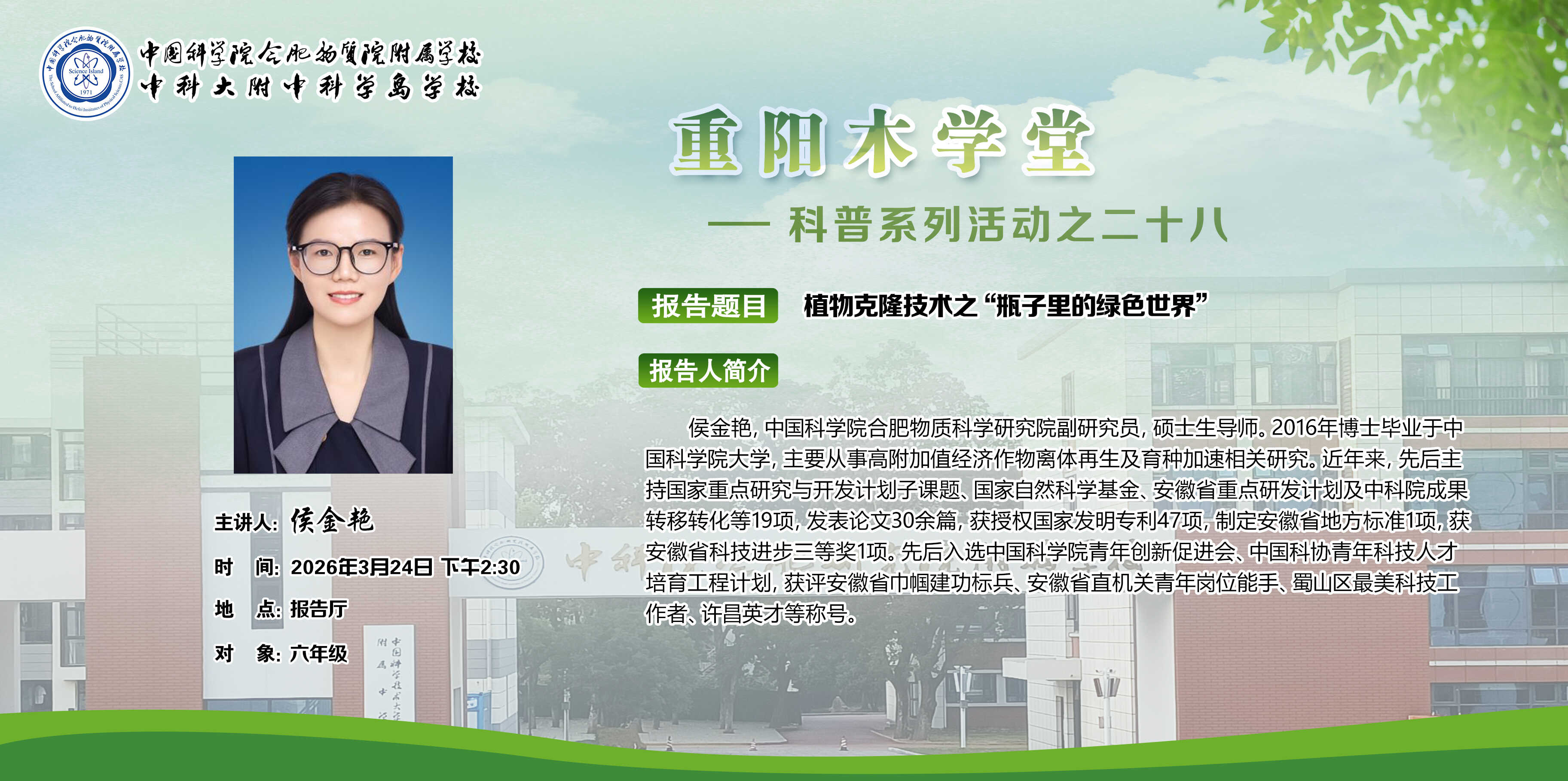 3月24日下午,我校“重阳木学堂”科普系列活动第二十八期在报告厅顺利举行。本次活动特邀中国科学院合肥物质科学研究院副研究员侯金艳老师,为六年级同学们带来了一场题为《植物克隆技术——瓶子里的绿色世界》的精彩科普讲座。